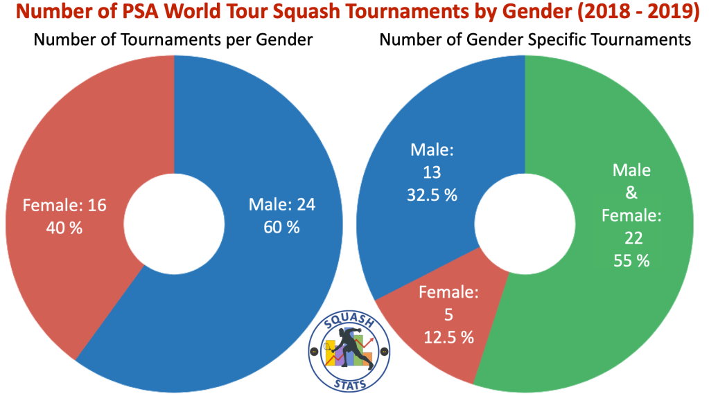 Let us first take a look at the number of titles in which male and female contestants compete. The pie chart below on the left illustrates the ratio of the male to female number of tournaments. For this particular pie chart, all gender tournaments are considered as individual tournaments (i.e the Oracle NetSuite Open is considered as one female tournament and one male tournament). It can be seen that the female players have a total of 16 tournaments (which is 40% of all tournaments) and the male squash players have 24 tournaments (which is 60% of all tournaments). This results in a male to female tournament ratio of 3:2. Of course these numbers do not represent the number of tournaments each player of each gender enters but rather the maximum number of tournaments available to that particular gender. However, the larger the number of tournaments, the more opportunity there is to optimize a player’s selection of tournaments in order to maximize their return on ranking points and prize money.