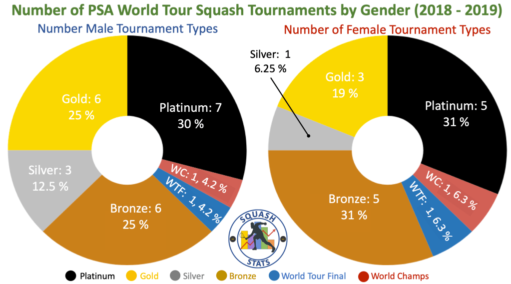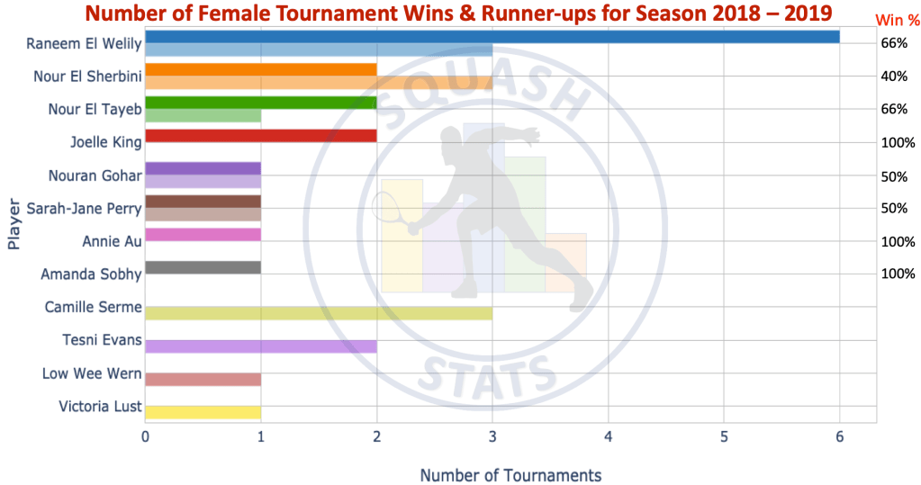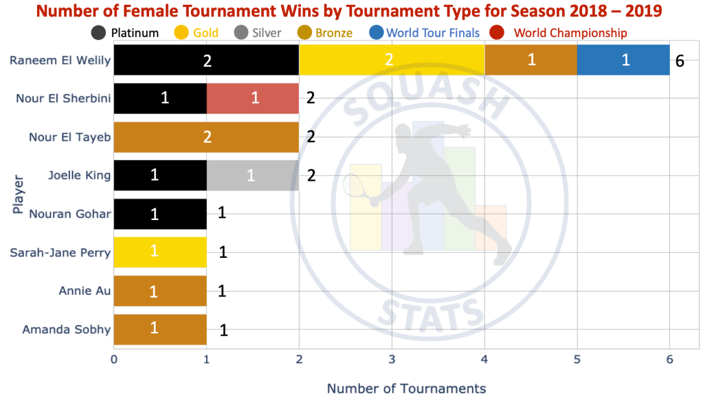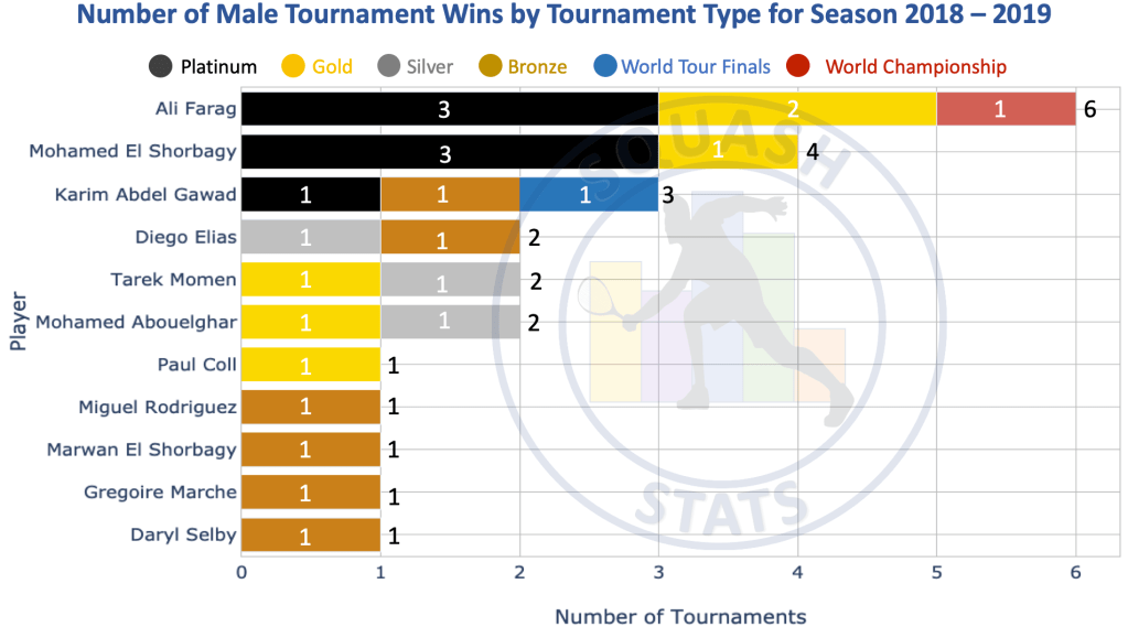 The 2018 – 2019 season was an exciting one. It saw the breakthrough years for several male squash players; Joel Makin, Zahed Salem and Declan James, as well as female squash players: Nele Gilis, Hania El Hammamy, and Yathreb Adel. On the flip side squash said goodbye to several of the games greats through retirement, such as Nick Mathew, Nicol David, Jenny Duncalf, RThe 2018 – 2019 season was an exciting one. It was a breakout year for several male and female squash players: Joel Makin, Zahed Salem, and Declan James on the men’s tour, and Nele Gilis, Hania El Hammamy, and Yathreb Adel on the women’s side. On the flip side squash said goodbye to several of the game’s greats through retirement, such as Nick Matthew, Nicol David, Jenny Duncalf, Ramy Ashour, and Laura Massaro. There are many metrics that can be used to help define how successful a player’s career or season has been. One can simply consider the number and type of tournaments won, the ranking in tournaments, prize money won, number of ranks climbed, or rank points gained. This blog post investigates the distribution of winners for the PSA World Tour tournaments for the 2018 – 2019 season.