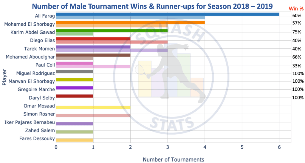 On the right hand side of these plots is the finals’ win percentage. This is the percentage of finals won out of the number of titles played for a given player. For example, Ali Farag won six finals, and came as runner-up on 4 occasions making a total of ten tournament finals. Therefore, his finals win percentage is 60% (six out of ten) finals played.