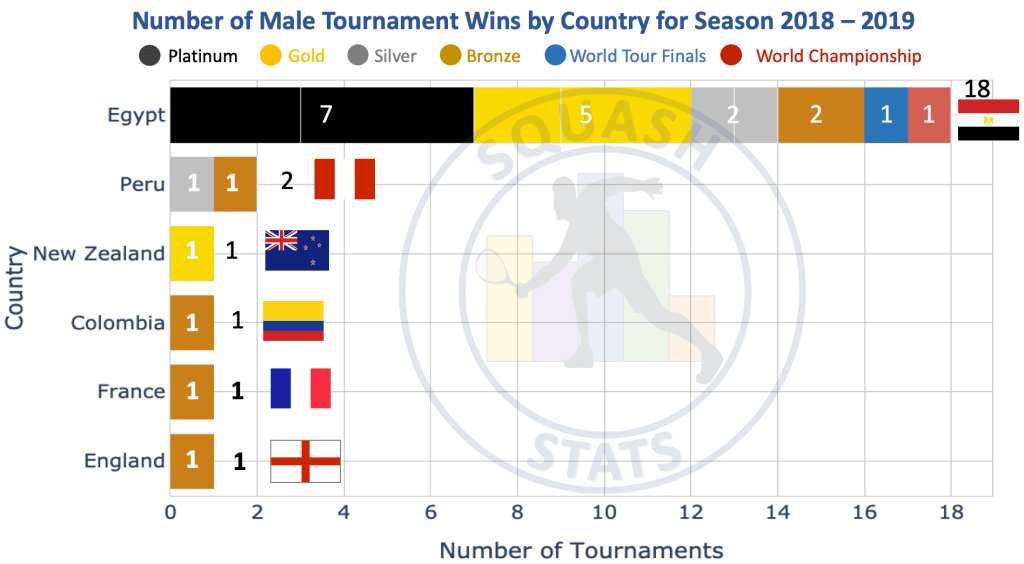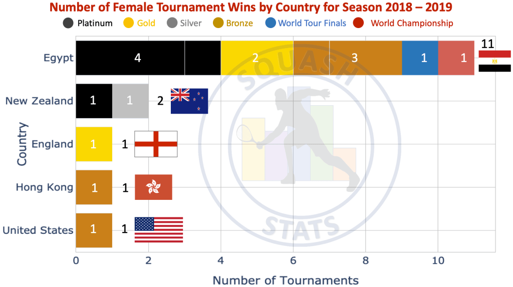 In the above section we can clearly see that there is a dominance of Egyptian players in terms of winning the male and female tournaments. This is not surprising given their overall dominance in the game in recent years, but perhaps it is not yet clear how dominant they were in the 2018 – 2019 season. The graphs below plots the tournament winners by country for both genders. In the male tournaments, Egyptians clearly dominated the top tournaments winning all the Platinum tournaments as well as the World Championship and the World Tour Finals. A total of 18 of the 24 male tournaments were won by Egyptian players (75% tournament win rate). Similarly, 11 of the 16 female tournaments were won by Egyptian players (68% tournament win rate).