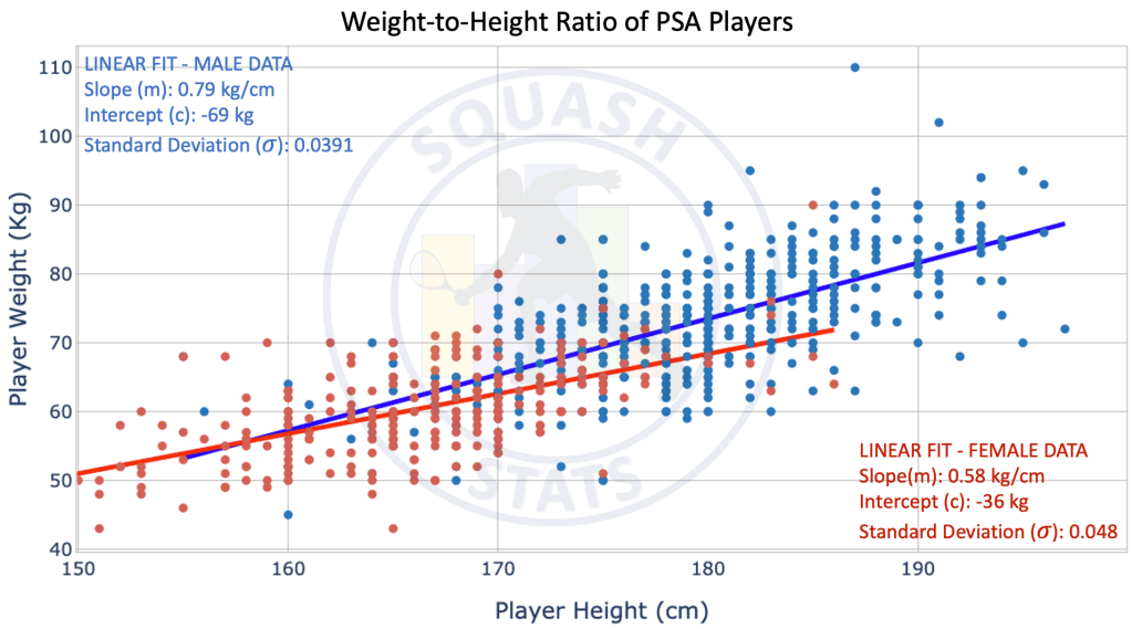 The plot below provides the weight to height ratio of the professional squash players (ranked 0 – 500) at a given particular time which is maintained throughout this article. In this plot each point represents an individual player. On the x-axis is the player’s height in centimeters and on the y-axis is the player’s weight in kilograms. The red dots are for female players and the blue dots are for female players. It can be seen that for both genders, as the players increase in height so too does their weight. This is of course very intuitive. It can also be seen that in general male players are taller and heavier. A linear line is fitted to the data of each gender and is shown in the below graph. This line illustrates the average weight of a player for varying heights, and vice versa. Details of the linear line are provided in the top left (male) and bottom right (female) corners of the plot. These lines have different slopes and thus diverge for increasing height. This essentially means that as players increase in height the average weight of each gender will differ and the larger the height the larger this difference will be. On average, a player’s weight will increase by 0.79 kg/cm and 0.58 kg/cm male and female players respectively. For a given height, on average males will be heavier than the average female player.