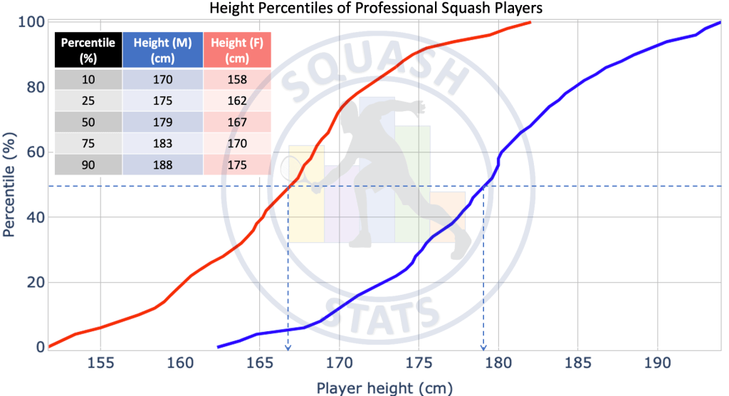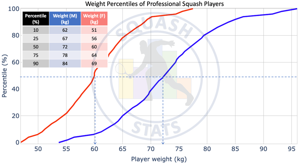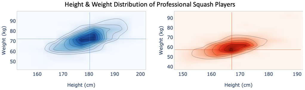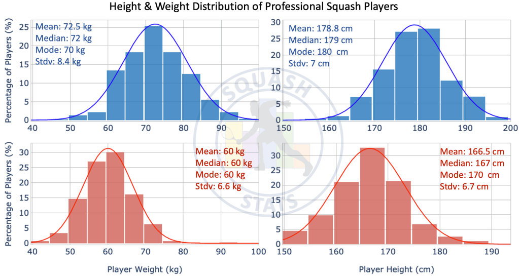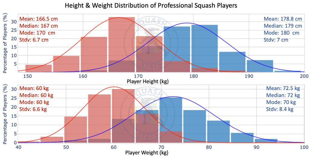 Squash is a highly demanding sport which requires a variety of physical attributes in order to play at a professional level. Amongst others, it requires physical strength, flexibility, quick reactions, stamina, and fitness. However, squash is not a sport whereby possession of a particular physiological trait, such as height, allows you to dominate over all others. A quick look at the top 25 players of each gender one can see that there are not many players who are excessively tall/short or light/heavy on the PSA World Tour. In fact there is a wide range of varying physiological traits indicating that any advantages posed by a particular trait can be overcome in one way or another. In this article we look at two specific physiological traits, namely the height and weight of players.