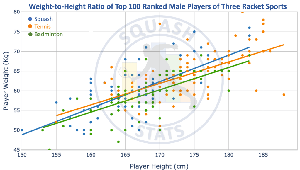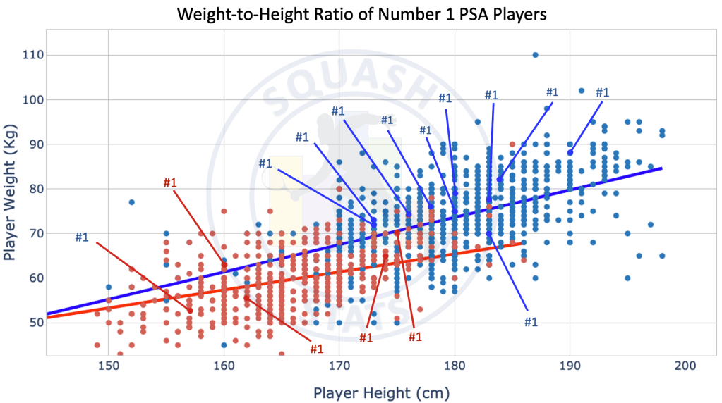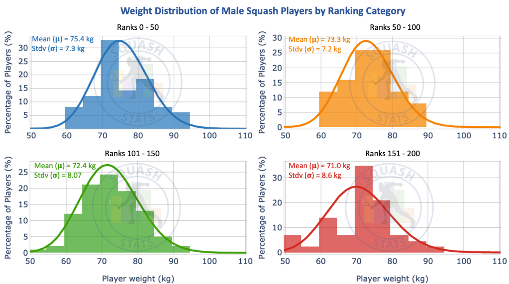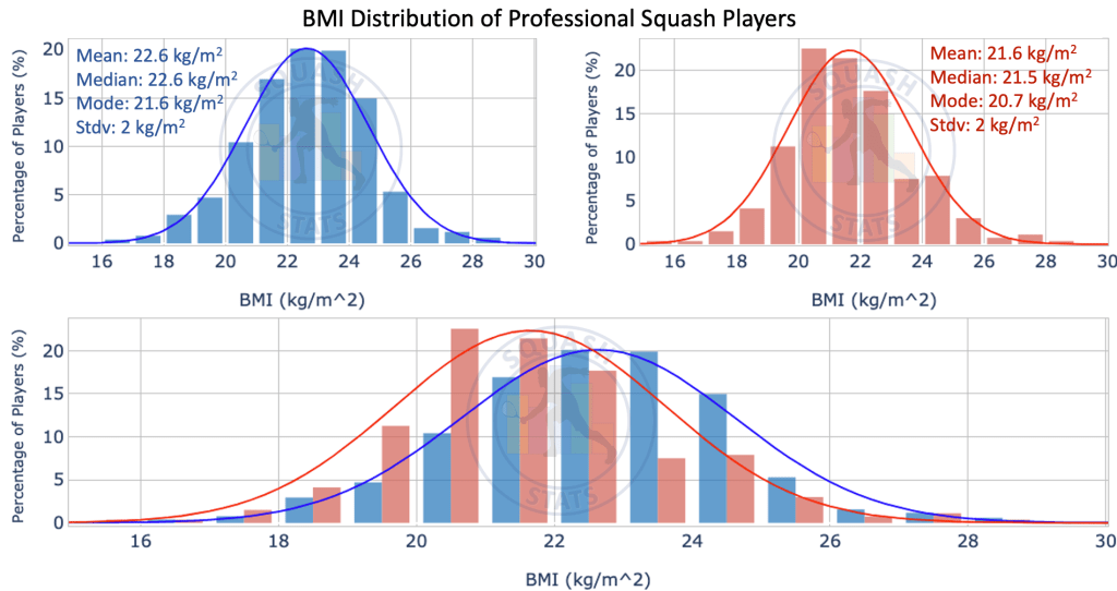 The data used in this article is taken from the player profiles on the PSA World Tour & Squash Info websites. The height of each player is assumed to be accurate and to remain constant throughout a player’s career. However it is very possible that a player’s physique and thus weight and BMI can change over time. In this article these possible weight variations are not considered and we assume a player has a constant and unchanging weight.