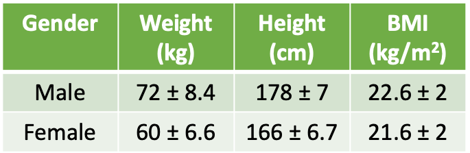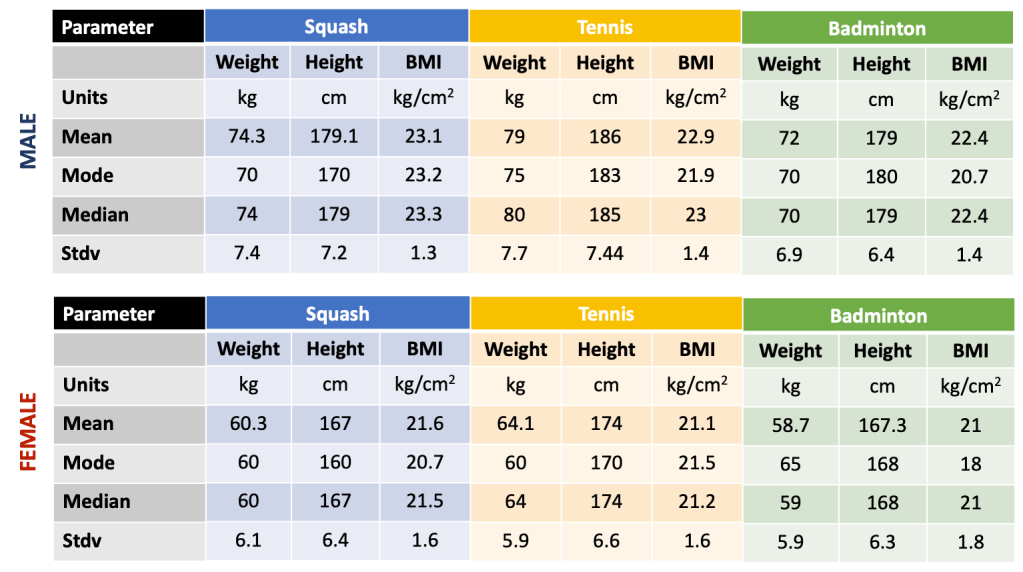 The following table represents the physical parameter of the average squash player for both genders. The standard deviation is also provided in order to understand the spread of players.