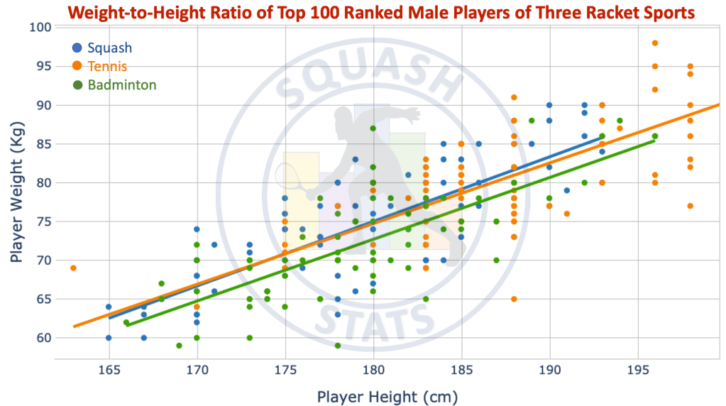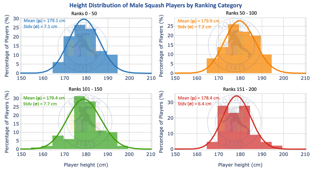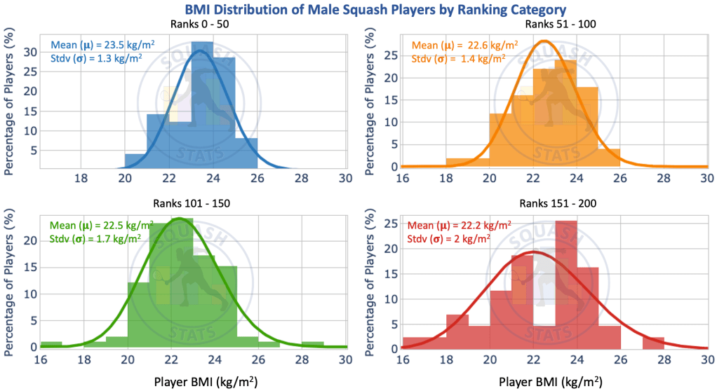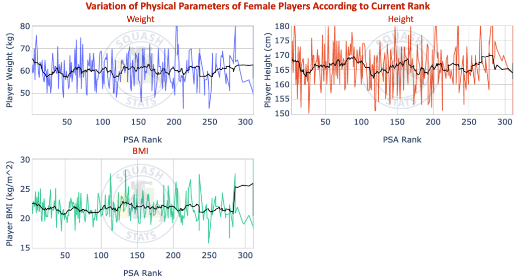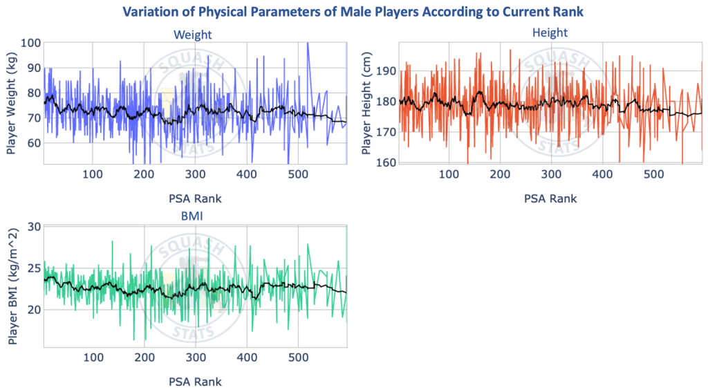 PSA COO Lee Beachill has been quoted as saying “Squash has long had a reputation as one of, if not the single most demanding racket sport out there courtesy of the complex movements required and the repeated bursts of short, intense action with little rest periods – without mentioning the mental focus and concentration needed to compete at the elite level”. Due to these physical demands one might initially expect that this would translate into strict demands on physiological constraints such as weight and height. However, throughout this article it has been show that squash players of all heights and weights are distributed through the PSA rankings. This indicates that whatever advantages posed by a specific height, weight or BMI, these advantages are not so large as to create a dominance by these players. This indeed can be viewed as a positive in attracting new or younger players, in that is is a sport whereby people of all shapes and sizes have potential to reach to top ranks.
