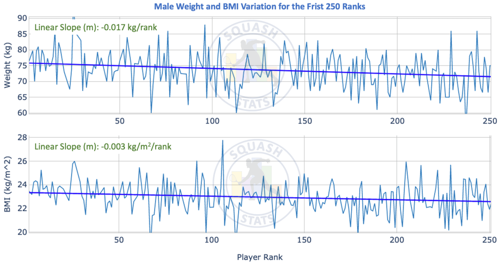 In addition to the ranked players at a particular point in time, the weight, height and BMI of players from the last 20 year were also considered, with the same trends as the current day players. Thus the size and shape of squash players has not changed to a large degree of the last 20 years.