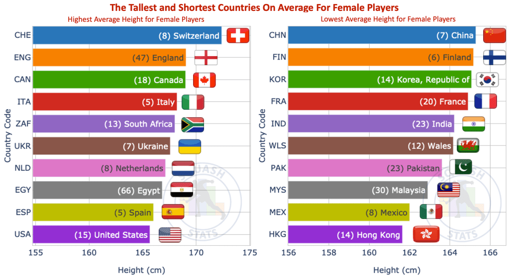 The following links provide information regarding the average height, weight and BMI of nationalities for both genders. To explore these parameters for professional squash players the players were grouped into their respective gender and country and the means were determined. In order to achieve reasonable statistical results, countries with groups of less than five players are excluded from this study. Otherwise the means would be too dependent on very few players or in many cases a single player. These results are plotted in horizontal bar charts below. Each parameter is split into the 2 charts; the left chart shows the largest ten and the right graph shows the lowest ten. In each bar is the name of the country as well as the number of players used to obtain the mean values.