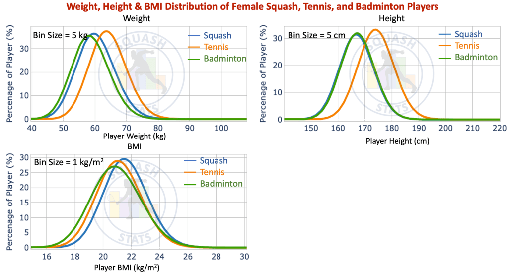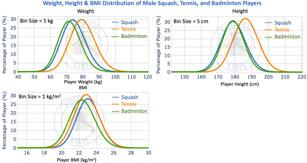 When compared to other racket sports, squash and badminton players have very similar weight, height and BMI distributions, although squash player have a slight larger BMI on average. Tennis players however are taller on average.