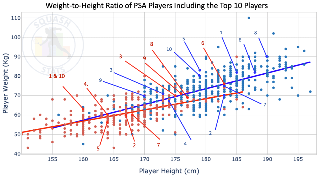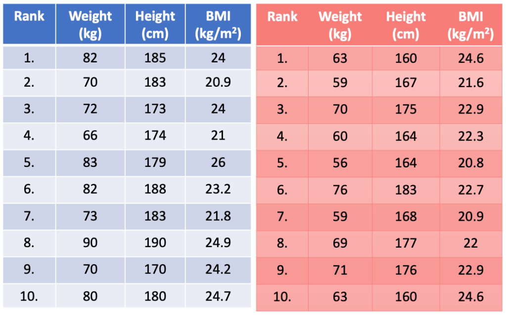 The following graph is identical to the one above but with the additional information of height and weight of the top 10 players of each gender. The rank of each top 10 player is indicated numerically and the gender is illustrated by the colour of the text and line. This information is also provided in tabular form below the plot where the weight, height and BMI is provided (the BMI will be expanded upon later in this article). As can be seen in both the table and the graph, the top 10 players are spread across the wide spectrum of heights and weights, both above and below the linear line indicating the average weight for particular height.