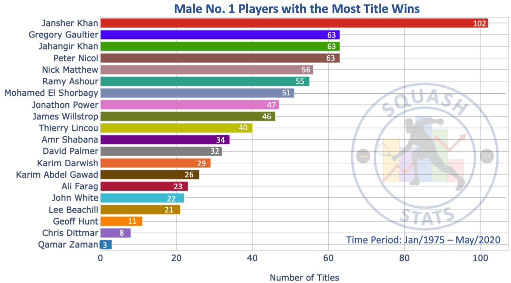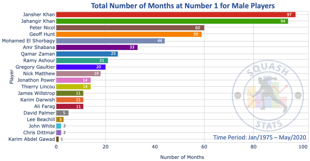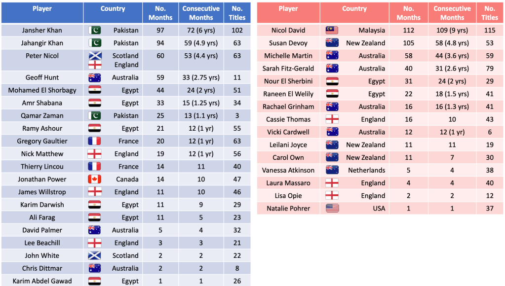 Time Limited Data: Throughout this article all men’s data is taken from January 1975 until May 2020,  and all women’s data is taken from April 1983 until May 2020. These dates are essential when electronic data started to be taken for each gender and is thus the starting point of this article. Unfortunately due to this time limitation on the data, great players like Heather McKay, Jonah Barrington, Hashim Khan etc are not considered.