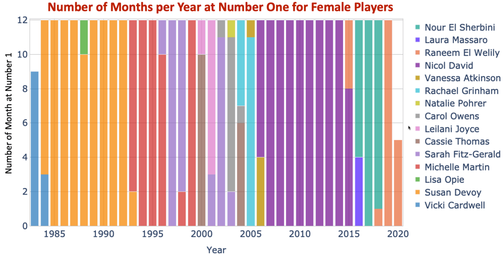 The same plots can be rendered for female players. Once again it can be seen that there is very often a complete dominance of a single player over long periods of time. This is illustrated by the bunches of the same coloured bars. These players are Susan Devoy (orange, 1984 – 1992), Sarah Michelle Martin (red, 1993 – 1996), Nicol David (purple, 2006 – 215) and Nour El Sherbini (green, 2016 – 2018). The other players dominated over a much shorter period of time.