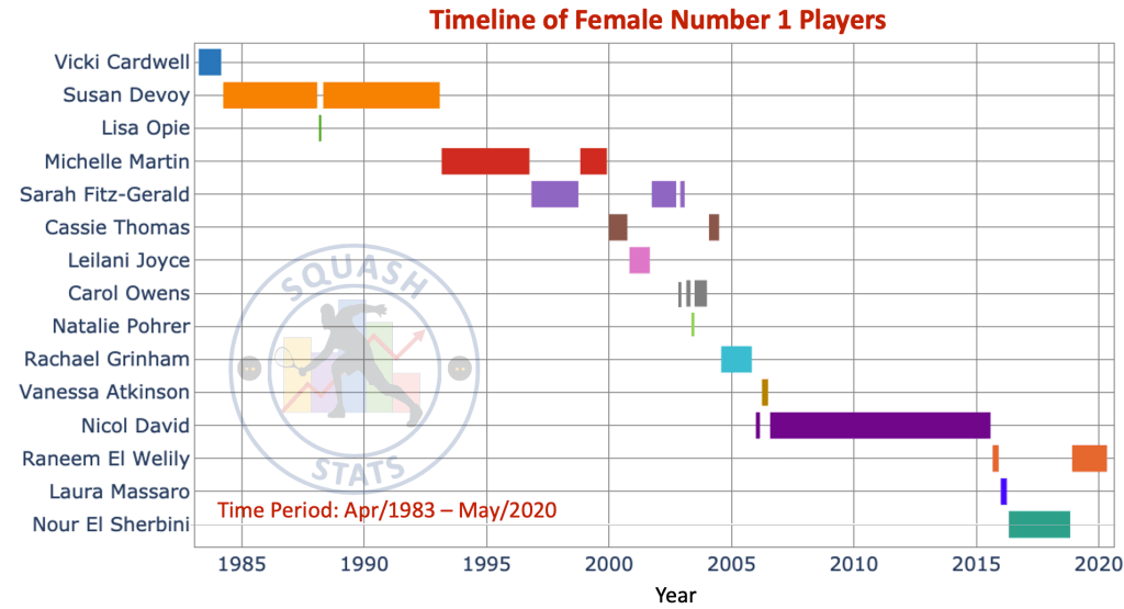 In the following timeline chart one can again see the periods of time for which each female number one player maintained the number one position. The aforementioned dominance of Susan Devoy and Nicol David is clearly evident by the long bars connected with their names. It can also be seen that Lisa Opie very briefly broke up a long dominance by Susan Devoy.