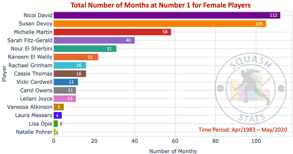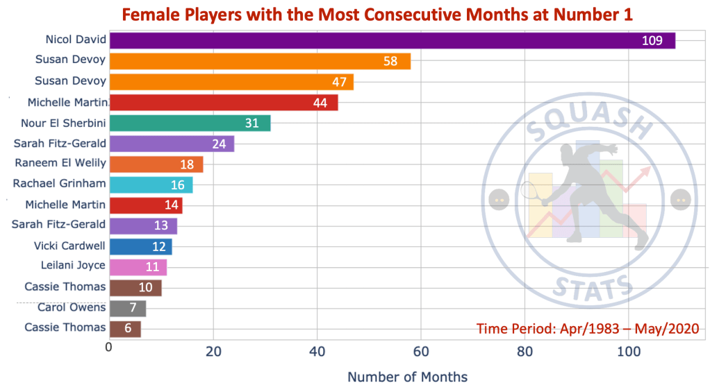 Nicol David had an amazing 109 (9.1 years) consecutive months at number one which far exceeds any other player’s record of consecutive months at number one. Susan Devoy has two long runs of consecutive months (58 months and 47 months) at the number one spot. These consecutive runs were disrupted solely by Lisa Opie who was at the number one position for 2 consecutive months.
