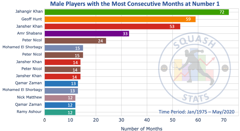 • The graph starts with Qamar Zaman as number one for several months and in February of 1976 Geoff Hunt took over and retained the number one position for 59 months (4.9 years).