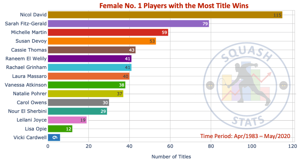 A similar situation is observed for the female number ones where the top five tournaments winners are Nicol David (112 titles, years at number one), Sarah Fitz-Gerald (79 titles, 24 months at number one), Michelle Martin (59 titles, 58 months at number one), Susan Devoy (53 titles, 105 months at number one), and Cassie Thomas (43 titles, 16 months at number one).