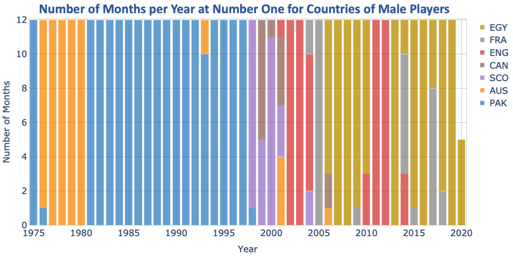 We can also look at the domination of the number of positions by nationality. The domination of the country of the number one spot can also be analysed. The below graph plots the number of months per year the player’s nationality has been at the number one position. The colours bunched together indicated the domination of a certain country. There have been several nationalities dominating the number one position, such as Australia (1976 – 1-980), Pakistan (1981 – 1997), Egypt (2006 – 2020 with brief interruptions from France and England).