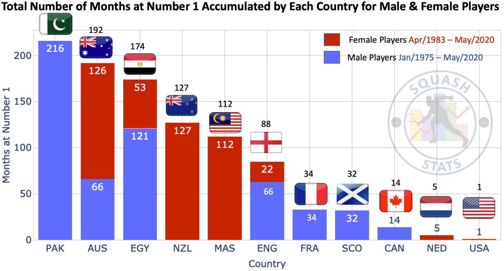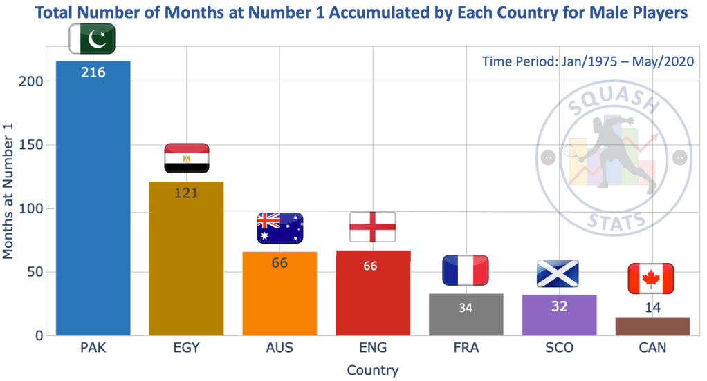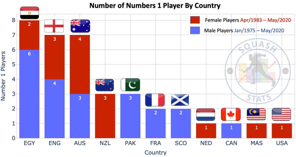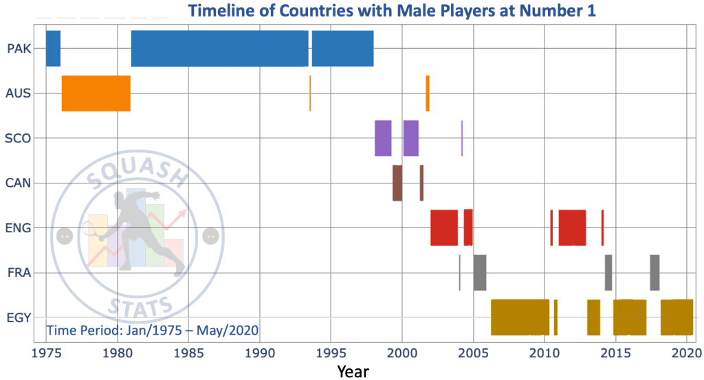 In recent months there has been a lack of new squash tournaments due to the world wide restrictions created by the COVID-19 pandemic. This has caused many people to revisit older squash matches both from this generation and previous generations of squash players. Each generation has had its own rivalries between players and countries, each gaining prominence at different times. In this article we explore the previous number one players, how long they maintained their number one ranking, which countries produced the most number 1 players and over which time periods.