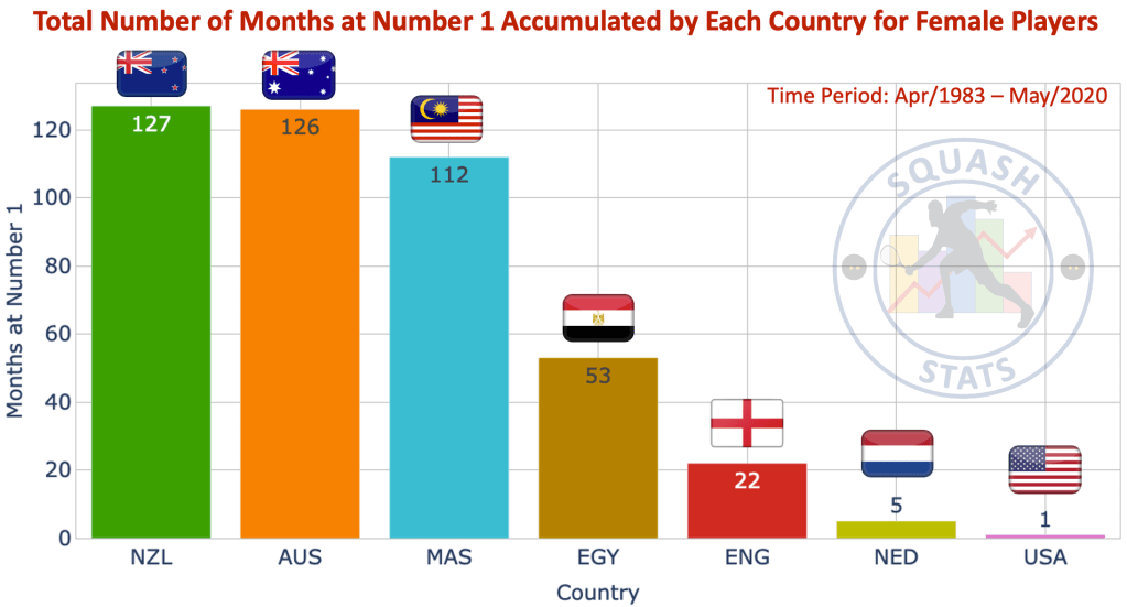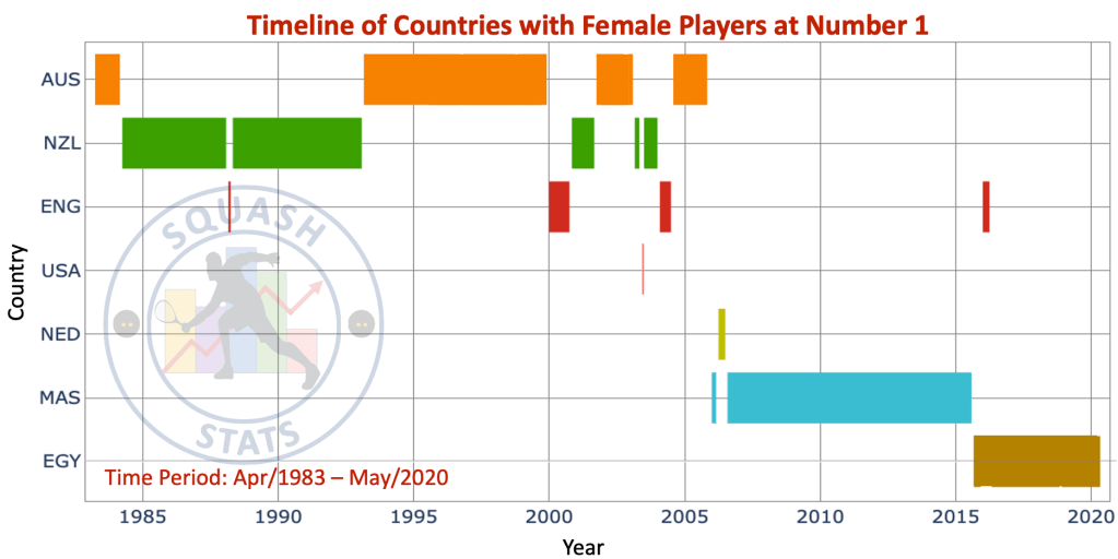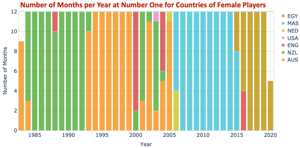 The same plots can be made for the female number ones. There are again certain countries which dominate the number one position for a long period of time, namely New Zealand (1986 – 1992), Australia (1993 – 1999), Malaysia (2006 – 2015), and Egypt (2016 – 2020).