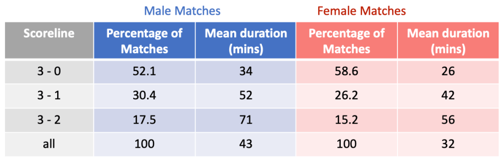 It is difficult to extract concrete conclusions from match durations statistics alone, mainly due to the fact there is a large variation and it depends on a lot of factors: the gender of the players, the stage of the tournament, and the rank difference between the players. However, this study provides a point of reference whereby matches can be compared to general trends. For example, if you watch a male fine that was 60 minutes long you can tell that this watch was slightly longer than average, but not by much (average male final is). It can also be an indication of competitiveness that perhaps the scoreline does not fully convey. For example if you watch a female match that ended in a 3-0 score but lasted 35 minutes, one can conclude that although the scoreline indicates a one-way dominance, the match duration is much larger than the average 3 – 0 scoreline (24.5 minutes) indicating it was more competitive.