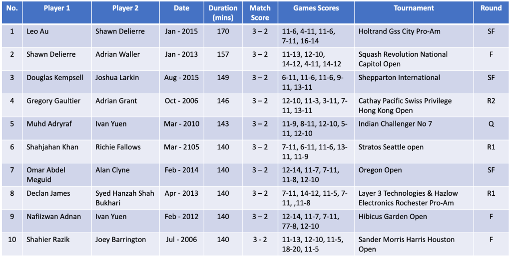 The longest male PSA Final match ever was between Adrian Waller (PSA rank 38 as of Jan 2013), from England, and Shawn Delierre (PSA rank 39 as of Jan 2013) from Canada who battled for 2 hours 37 minutes (157 mins) in the final of the Squash Revolution National Capital Open in the USA. Shawn Delierre won the match on 9/1/2013 with a score of 3:2 (11-13, 12-10, 14-12, 4-11, 14-12). to read more about this game please read the Time Colonist article
