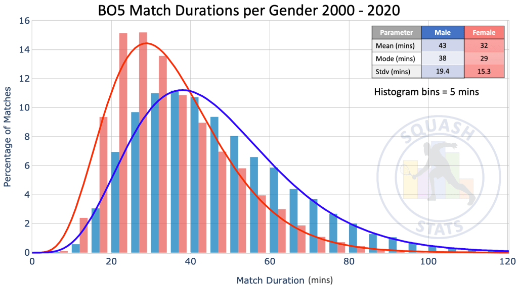 The bar chart below illustrates the distribution of all the male and females PSA matches between 2000 – 2020 which are plotted in blue and red respectively. The percentage of matches per gender is indicated on the y-axis and the match duration in minutes is indicated on the x-axis. This histogram is plotted with a bin-size of five minutes which means that each bar represents a five minute period of time. For example, the plot below indicates 11% of male matches are between 40 – 45 minutes in duration. Each data set is fitted with a gamma distribution which is indicated by the full red and blue curves.