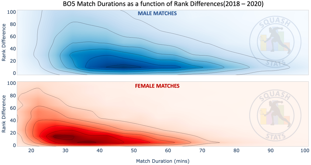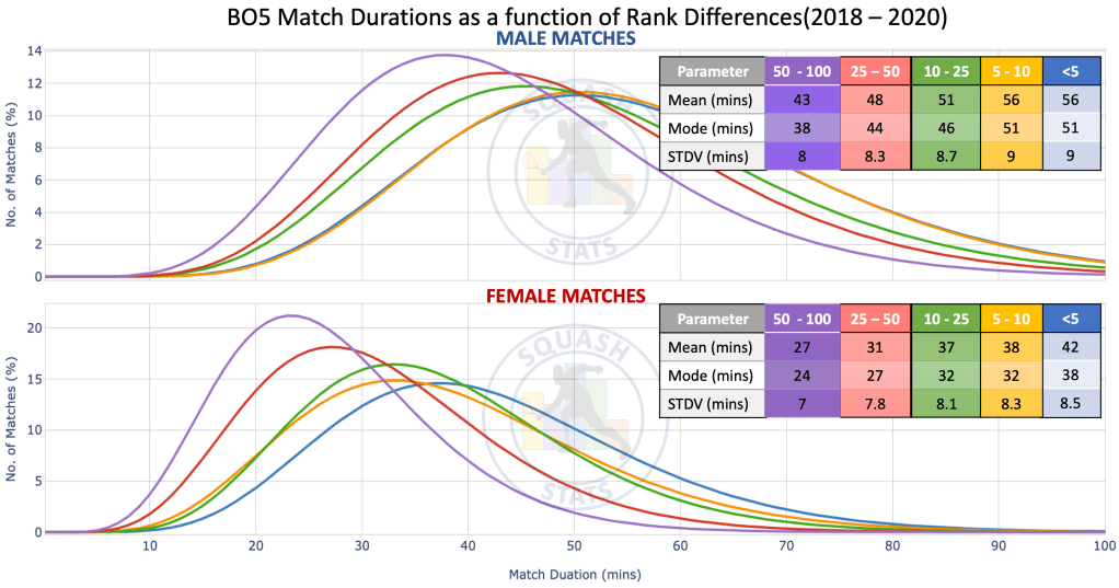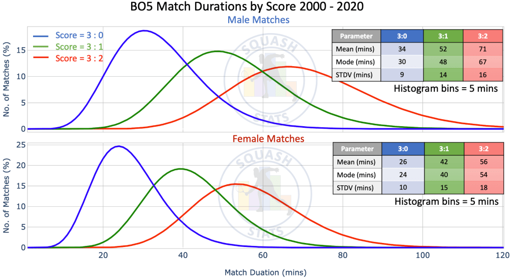 In this article Squash Stats will take a look at how the match durations have varied over the last 20 years. It is difficult to define absolute relationships from match durations statistics alone, mainly due to the fact there is a large variation in durations and it depends on a lot of factors. However, in this article we provide a point of reference whereby matches can be compared to general trends. We explore the match durations in terms of gender, tournament stage, scoreline, and player rank difference. We conclude the article by taking a look at the average match durations for current and previous players.
