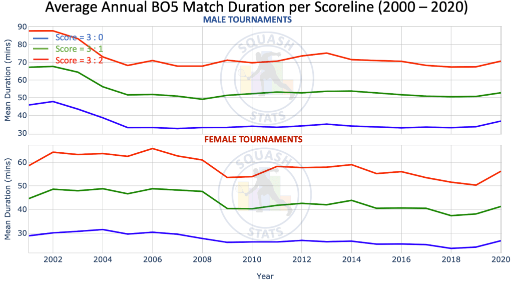 Using this technique to categorize the matches by their scorelines, we can also look at the mean match duration for each gender annually. The plot below shows the average match duration for all matches in a given year per scoreline for each gender. It can be seen that during 2000 – 2005 the duration of the average male matches decreased in length. This happened proportionally for all scorelines indicating that it may have been due to a change in the game rules. This is most likely due to the implementation of the PAR scoring system in 2000. However, since 2005, male match durations have remained reasonably constant.