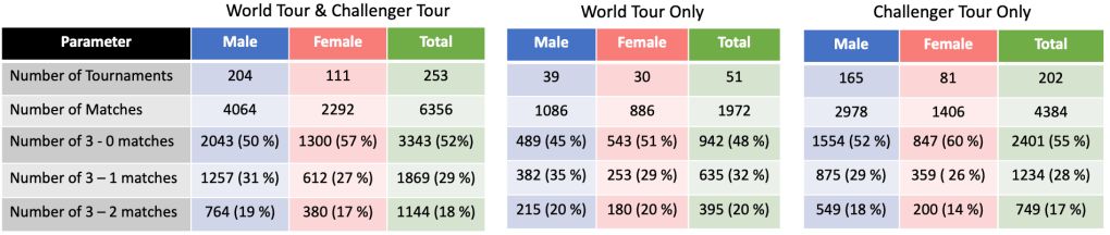 The following are the statistics of the aforementioned data-set (2018 – 2020) which is split into three categories: the World Tour and Challenger Tour combined; only the World Tour matches; and only the Challenger Tour matches.
