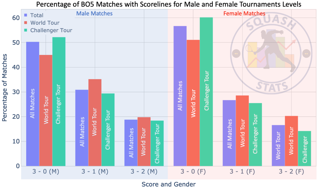 It can be clearly seen from the above bar-chart that for both genders and for both the World Tour and Challenger Tour matches, the percentage of matches decreases with increasing number of games (3-0 -> 3-1 -> 3-2). We can say, on average ~55% of matches end with a score of 3 – 0, ~30% of matches end with a score of 3 – 1, and ~20% of matches end with a score of 3 – 2. This is most likely due to the format of the tournaments whereby the games in the early stages of the tournaments often have a larger PSA ranking gap between the players and thus have a much higher percentage of 3 – 0 and 3 – 1 scores. this can have a large effect on the average match duration of the genders. for example the that there is a larger number of 3-0 scoreline matches (50 – 55%) and we know from previous plots in this article that these matches tend to be shorter in duration, this will decrease the match duration average.