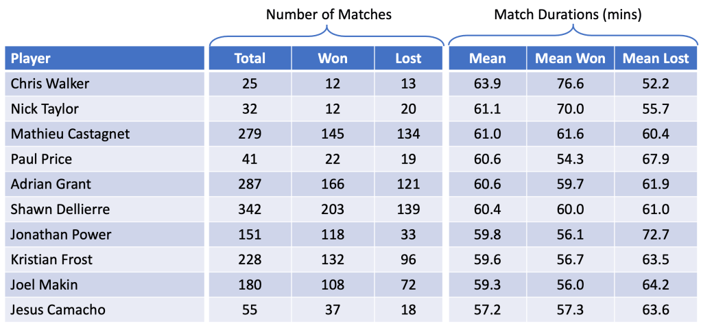 Let’s now take a closer look at the mean match duration for matches won (‘Mean Won’) and matches lost (‘Mean Lost’). It can be seen that some players have a similar match duration for matches won and lost (e.g. Miguel Rodriguez, Shawn Delierre). These players in general will have long matches whether they win or lose.