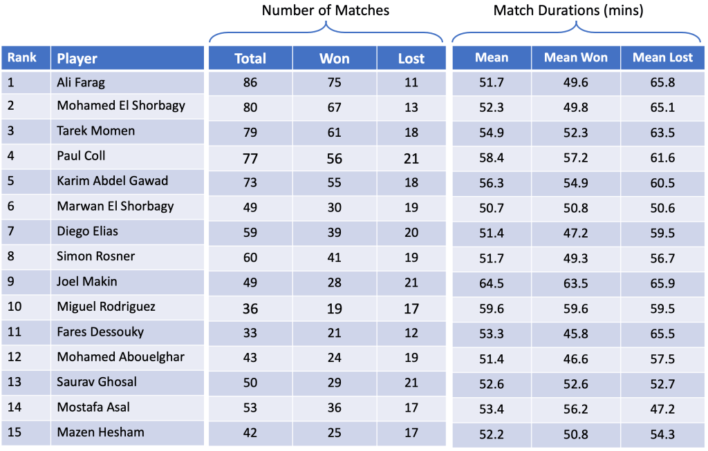 As with most of our articles, the majority of the data has been taken from Squash Info – the definitive squash resource which is a regularly updated website with a large database of match results, ranking, and player profiles, match history and much more.