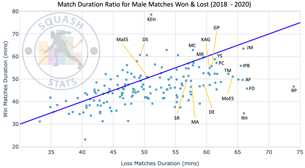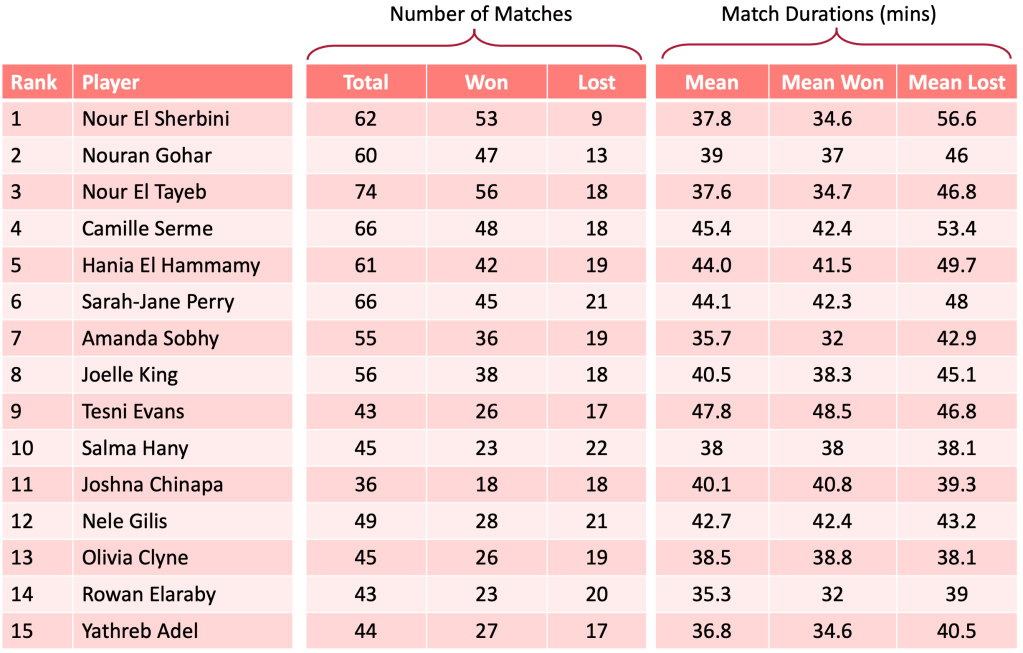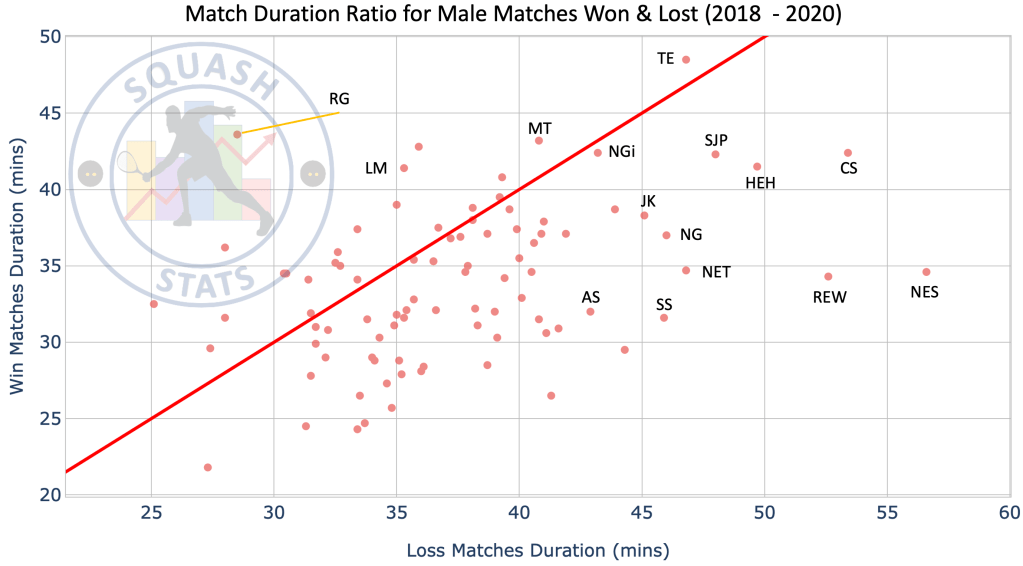 Of particular note in this plot are Camille Serme (CS), Raneem El Welily (REW) and Nour El Sherbini (NS) who are very far to the right of the graph indicating that any match they lose is a longer match.