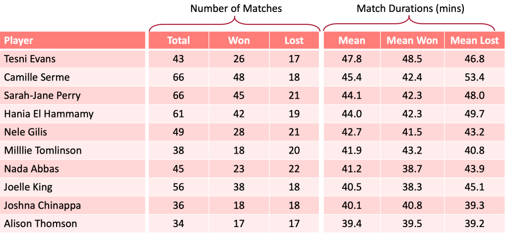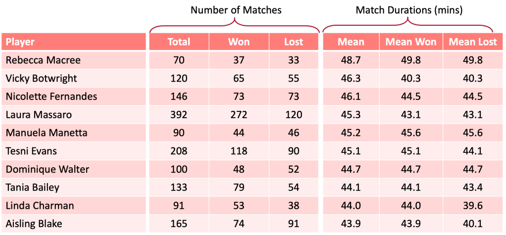 The table below is of the same format as those for the males above and is ranked in order of longest mean match duration. Topping the table is Tesni Evans with the longest match durations: