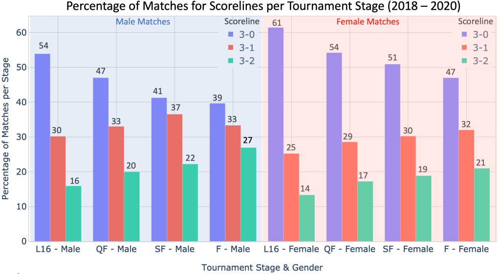 The above effect is explained by the fact that earlier stages will have matches whereby there is a larger PSA rank difference between players and thus result in shorter matches. This effect is verified by the following bar-chart where one can see that early stage matches have more 3 – 0 matches (54% for males and 60% for females) which we have already deduced are on average shorter. Similar to a previous plot, this below plot is split vertically with male matches on the left with a blue shaded background and female matches on the right with a red shaded background. The tournament stage for each gender is provided on the x-axis and the percentage of matches is provided on the y-axis. The coloured bars in each group represent the different scorelines which are indicated by the legend. For example for the furthest left group of bars one can determine that 54% of matches in the last 16 stage (L16) end with a scoreline of 3-0, 30% with a scoreline of 3-1, and 16% with a scoreline of 3-2. As one progresses towards the final, in general the percentage of 3-1 and 3-2 scorelines increase and the 3-0 scorelines decreases. This this increases the average match durations and one progresses from the last 16 (L16) to the final (F).